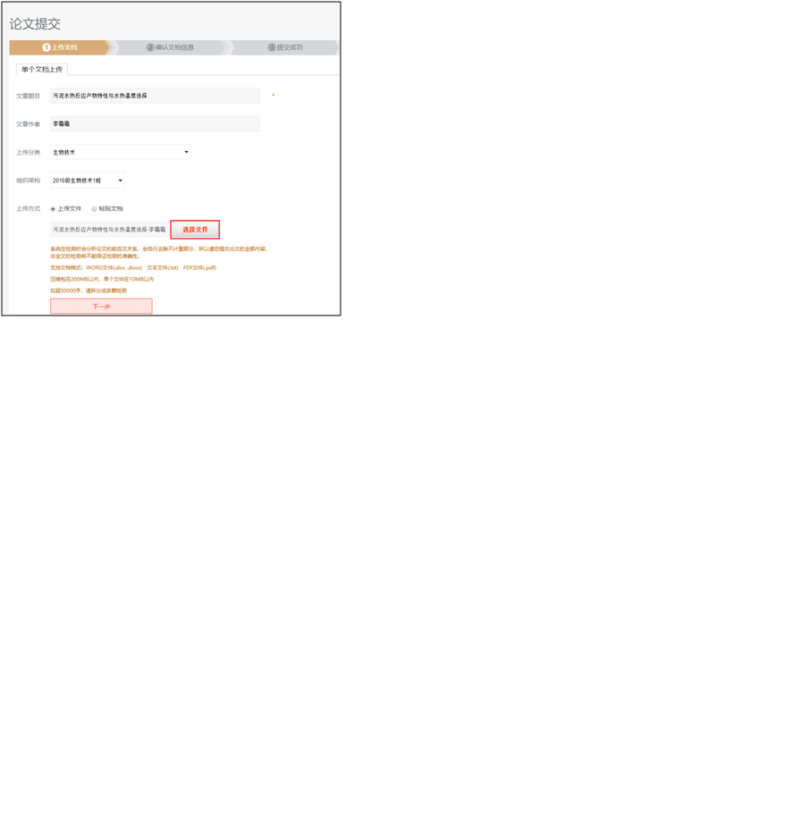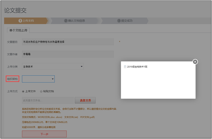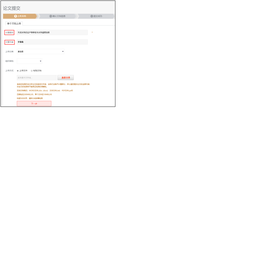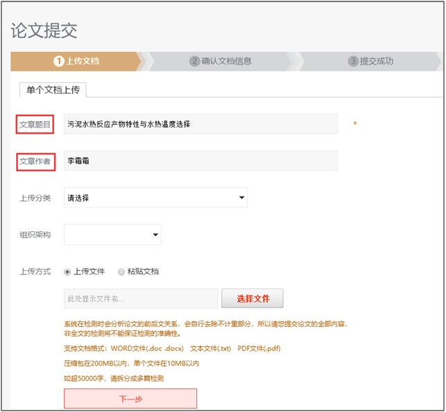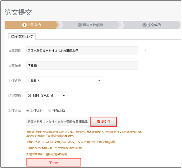 6.上传方式-可选择直接上传文件(文件大小在10M以内,如超50000字,请拆分成多篇检测,支持文件格式为WORD文件(.doc .docx) 文本文件(.txt) PDF文件(.pdf),建议使用WORD文件(.doc .docx))