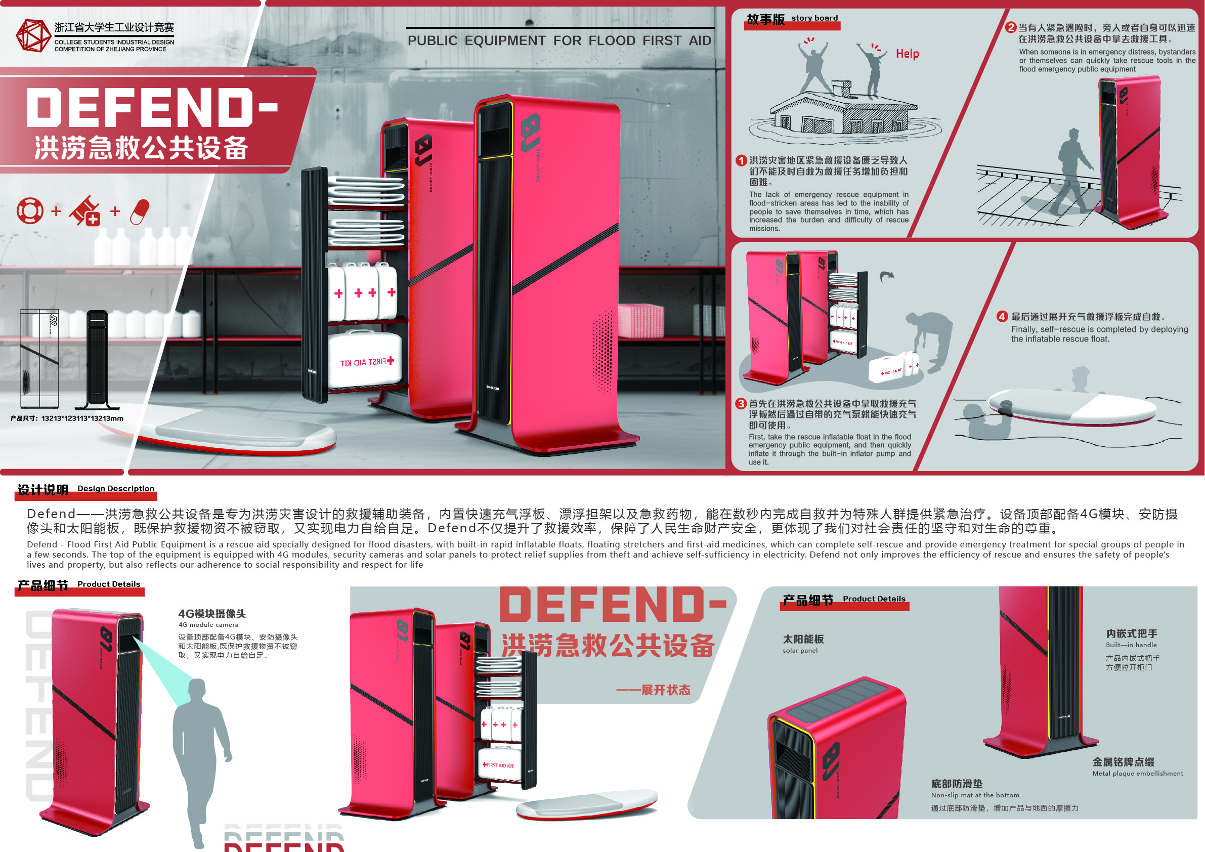 Defend--洪涝急救公共设备是专为洪涝灾害设计的救援辅助装备,内置快速充气浮板、漂浮担架以及急救药物,能在数秒内完成自救并为特殊人群提供紧急治疗。设备顶部配备4G模块、安防摄像头和太阳能板,既保护救援物资不被窃取,又实现电力自给自足。Defend不仅提升了救援效率,保障了人民生命财产安全,更体现了我们对社会责任的坚守和对生命的尊重。