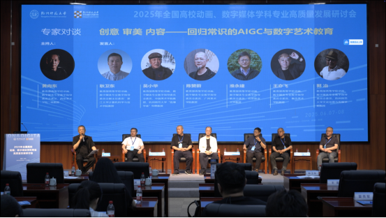 论坛深度聚焦教育链与产业链衔接,推动校企共建“三位一体”育人机制。下午的圆桌论坛分为“专家对谈”与“行业对话”两场,其中“专家对谈”由教育部高等学校动画、数字媒体专业教学指导委员会委员、西安美术学院黄向东教授主持,邀请了六位教育部高等学校动画、数字媒体专业教学指导委员会委员,浙江大学耿卫东教授、中国美术学院吴小华教授、广州美术学院陈赞蔚教授、北京林业大学淮永建教授、鲁迅美术学院王亦飞教授、日本无码a片 郭冶教授,他们围绕“创意、审美、内容——回归常识的AIGC与数字艺术教育”展开对话并形成了共识,讨论反思了AI生成作品的评估标准、学生就业方向等现实问题,提出以“人机共生”理念推动学科与产业的双向突破,呼吁教育回归人文内核,避免技术异化创作。
